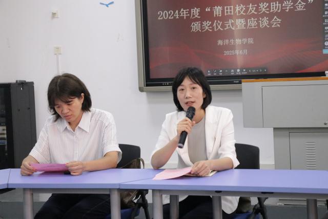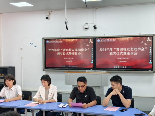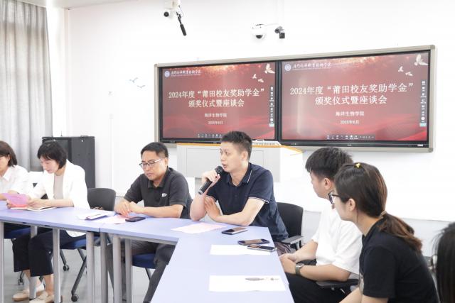 盛夏的翔安校区,绿树成荫,生机勃勃,处处洋溢着青春与希望的气息。6月15日上午,海洋生物学院举行2024年度莆田校友奖助金颁奖仪式暨座谈会。党总支书记赵梅英、院长蔡真珍、党总支副书记周晓翠、副院长何艺宾、校友办黄瑞武老师、学院辅导员及获奖助学生们齐聚一堂,共同见证这一温暖且意义非凡的时刻。