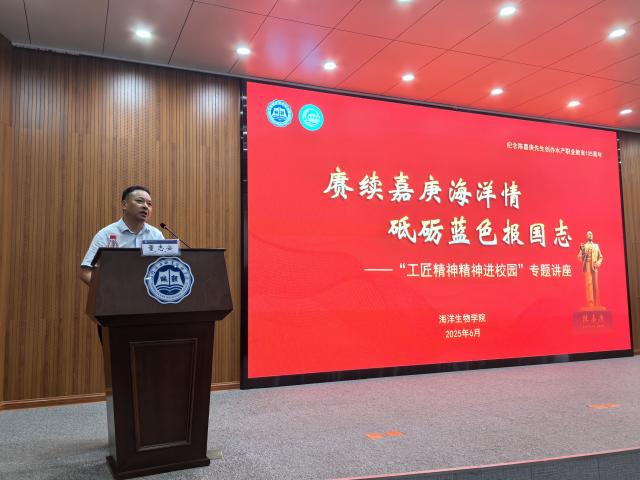 在纪念陈嘉庚先生创办水产职业教育105周年之际,6月10日,海洋生物学院在翔安校区T2报告厅举办“工匠精神进校园”优秀校友专题讲座。本次讲座由养殖791班杰出校友、福建一嘉海带苗业有限公司董事长、“大国农匠”董志安主讲。学院党政班子参加,副院长何艺宾主持活动。