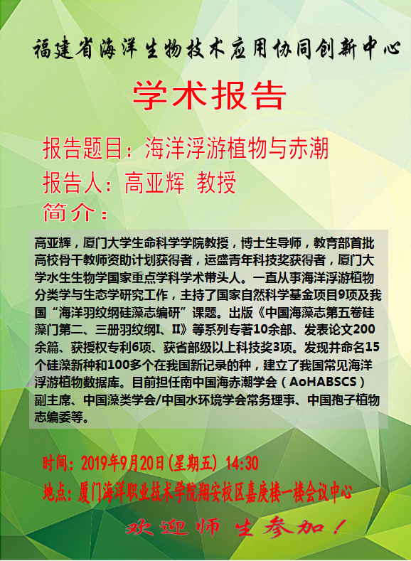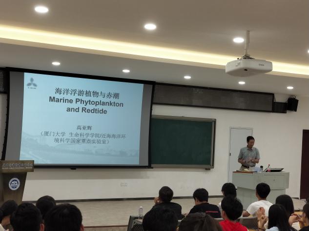 2019年09月20日,高亚辉老师受邀来到厦门海洋学院,在福建省海洋生物技术应用协同创新中心为“协同创新班”的同学们带来《海洋浮游植物与赤潮》的专题讲座。