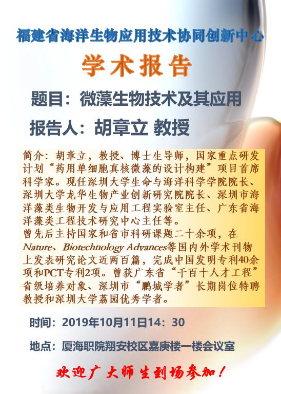 2019年10月11日,胡章立老师受邀来到厦门海洋学院,在福建省海洋生物技术应用协同创新中心为“协同创新班”的同学们带来《微藻生物技术及其应用》的专题讲座。