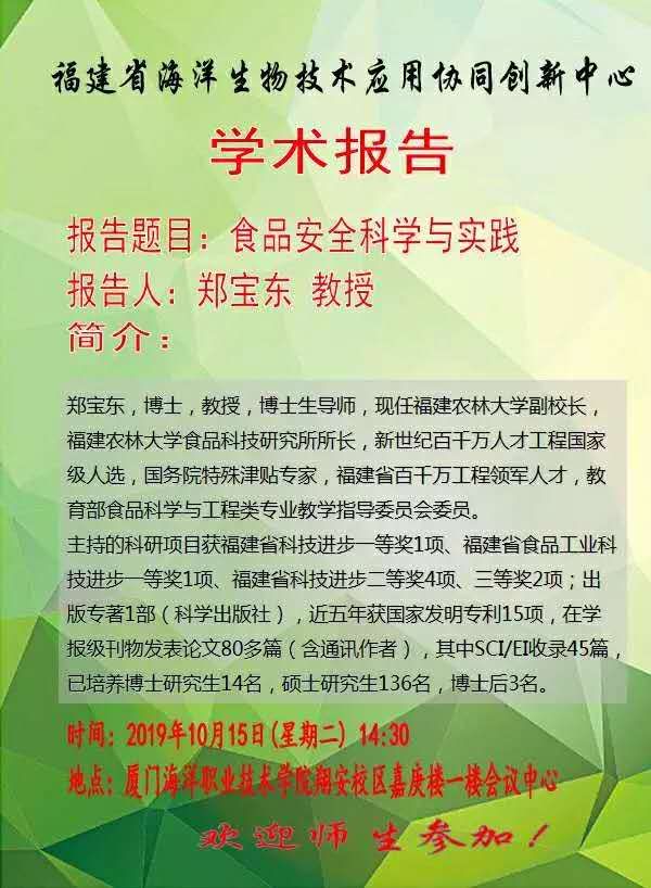 2019年10月15日,郑宝东老师受邀来到厦门海洋学院,在福建省海洋生物技术应用协同创新中心为“协同创新班”的同学们带来《食品安全科学与实践》的专题讲座。
