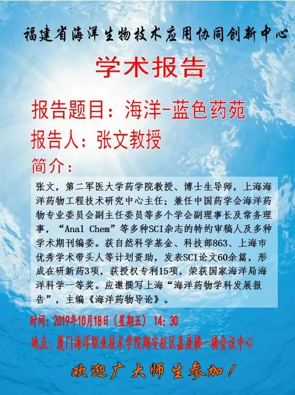 2019年10月18日,张文老师受邀来到厦门海洋学院,在福建省海洋生物技术应用协同创新中心为“协同创新班”的同学们带来《海洋-蓝色药苑》的专题讲座。