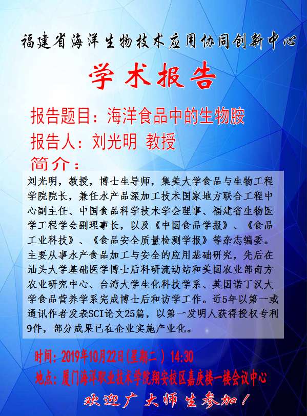 2019年10月22日,刘光明老师受邀来到厦门海洋学院,在福建省海洋生物技术应用协同创新中心为“协同创新班”的同学们带来《海洋食品中的生物胺》的专题讲座。
