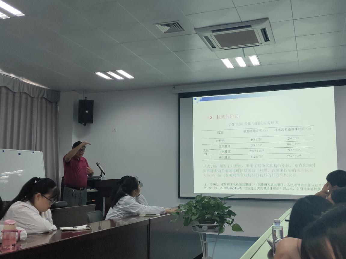 陈清西教授给我们讲述鳄鱼产品的开发与应用,创新班的同学一开始对于鳄鱼都感到惊讶,好奇它的作用到底是什么。教授从研究背景、现状、主要内容和现阶段工作取得的科研进展这几个方面来概括。鳄鱼的药用价值极高,含有人体所需的必需氨基酸和不饱和脂肪酸。鳄鱼大多应用在皮革以及餐饮行业,在保健品方面的应用也多。同时,它还是治疗胃溃疡、气管炎、哮喘病之佳品。研究内容方面包括鳄鱼肉酶解水解液、多肽粉,还有鳄鱼油烫伤膏。听教授的讲解满足了同学们对鳄鱼的好奇心。