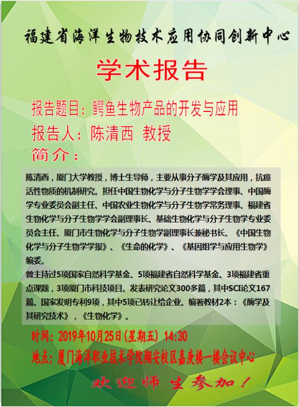 2019年10月25日,陈清西老师受邀来到厦门海洋学院,在福建省海洋生物技术应用协同创新中心为“协同创新班”的同学们带来《鳄鱼生物产品的开发与应用》的专题讲座。