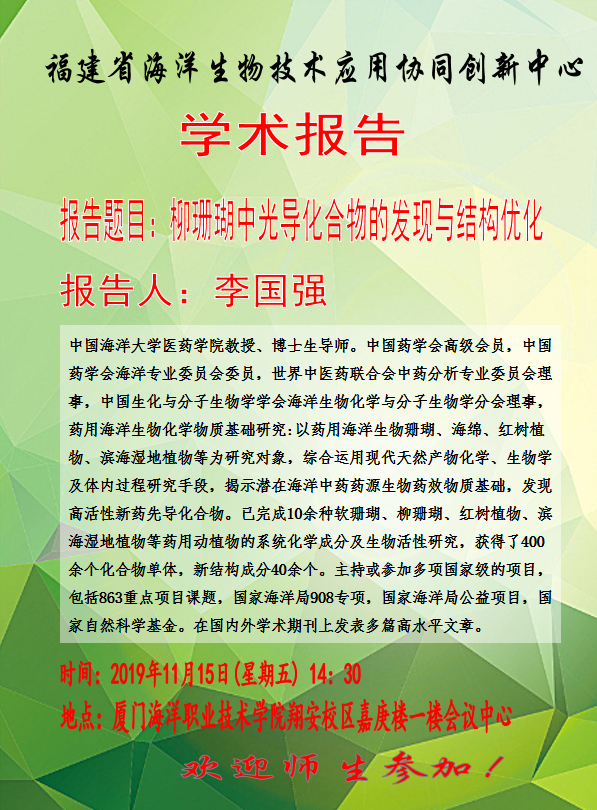 2019年11月26日,李国强老师受邀来到厦门海洋学院,在福建省海洋生物技术应用协同创新中心为“协同创新班”的同学们带来《柳珊瑚中先导化物的发现与优化研究》的专题讲座。