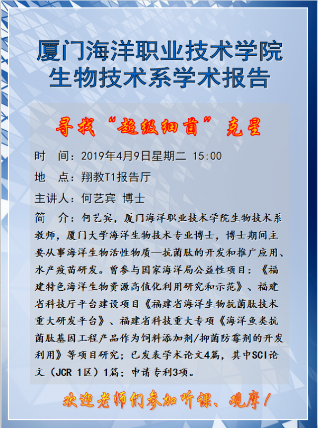 4.主讲嘉宾:何艺宾,厦门海洋职业技术学院生物技术系教师,厦门大学海洋生物技术专业博士,博士期间主要从事海洋生物活性物质--抗菌肽的开发和推广应用、水产疫苗研发。曾参与国家海洋局公益性项目:《福建特色海洋生物资源高值化利用研究和示范》、福建省科技厅平台建设项目《福建省海洋生物抗菌肽技术重大研发平台》、福建省科技重大专项《海洋鱼类抗菌肽基因工程产品作为饲料添加剂/抑菌防霉剂的开发利用》等项目研究;已发表学术论文4篇,其中SCI论文(JCR 1区)1篇;申请专利3项。