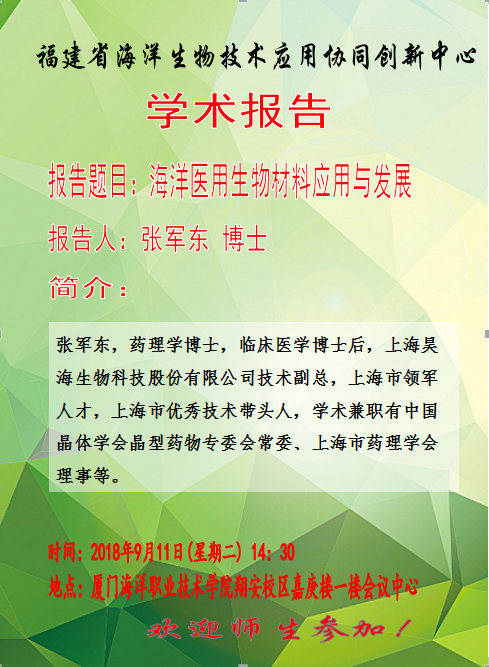 2018年9月11日药理学博士,临床医学博士后张军东受邀来到厦门海洋学院,给“协同创新班”的同学们带来了题为--《海洋医用生物材料应用与发展》的学术报告。