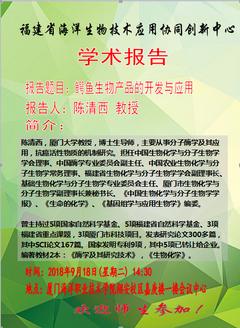 2018年9月18日厦门大学生命科学学院陈清西教授受邀来到厦门海洋学院,给“协同创新班”的同学们带来了题为--《鳄鱼生物产品的开发与应用》的学术报告。