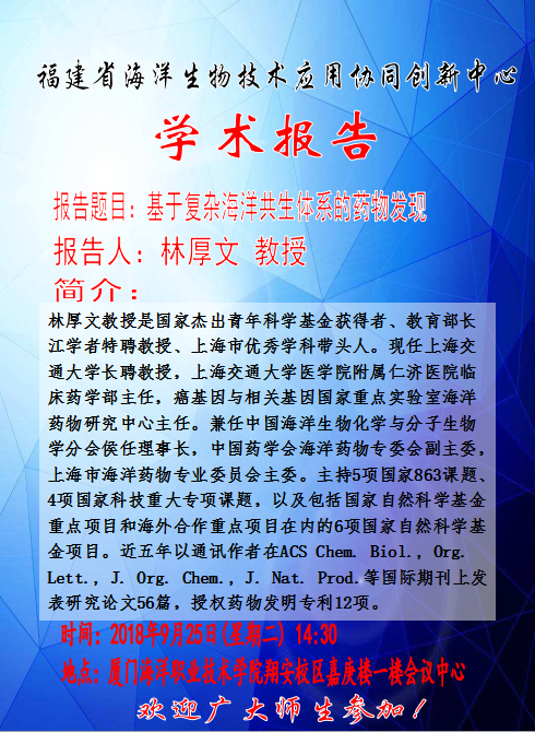 2018年9月25日林厚文教授受邀来到厦门海洋学院,给“协同创新班”的同学们带来了题为--《基于复杂海洋共生体系的药物发现》的学术报告。