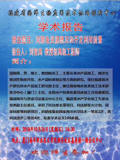 2018年10月26日刘智禹教授受邀来到厦门海洋学院,在福建省海洋生物技术应用协同创新中心为“协同创新班”的同学们带来题为——《河豚鱼资源概况和开发利用前景》的学术报告。