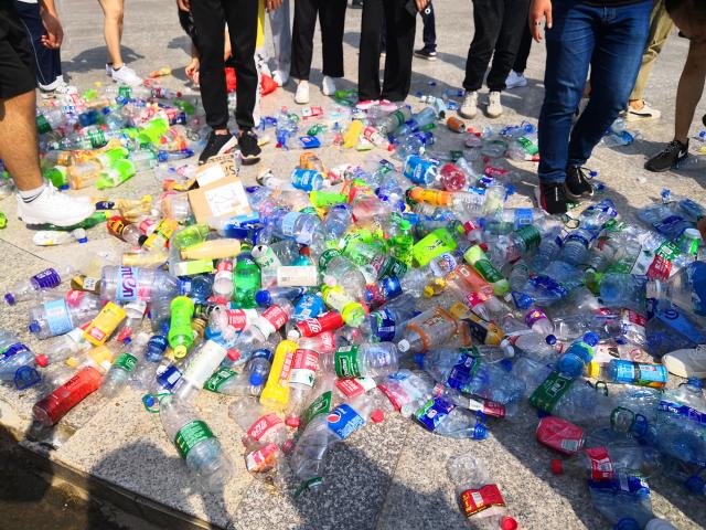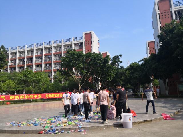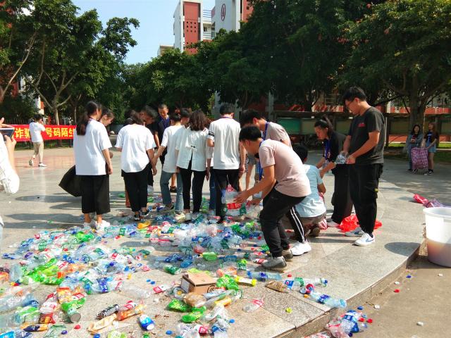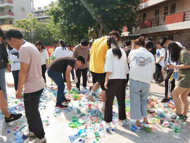 收集完瓶子后干事们回到圆盘把瓶子里的水倒干净踩扁然后分类装进编织袋里,并且将圆盘清洗干净。各部门干事分工合作,有条不素的进行着这项活动。
