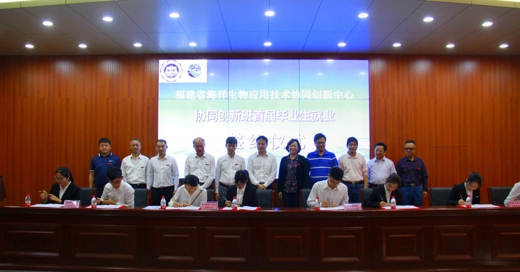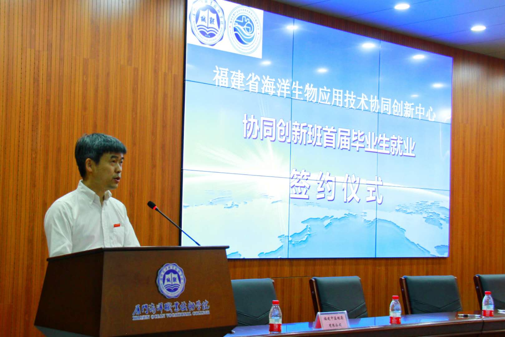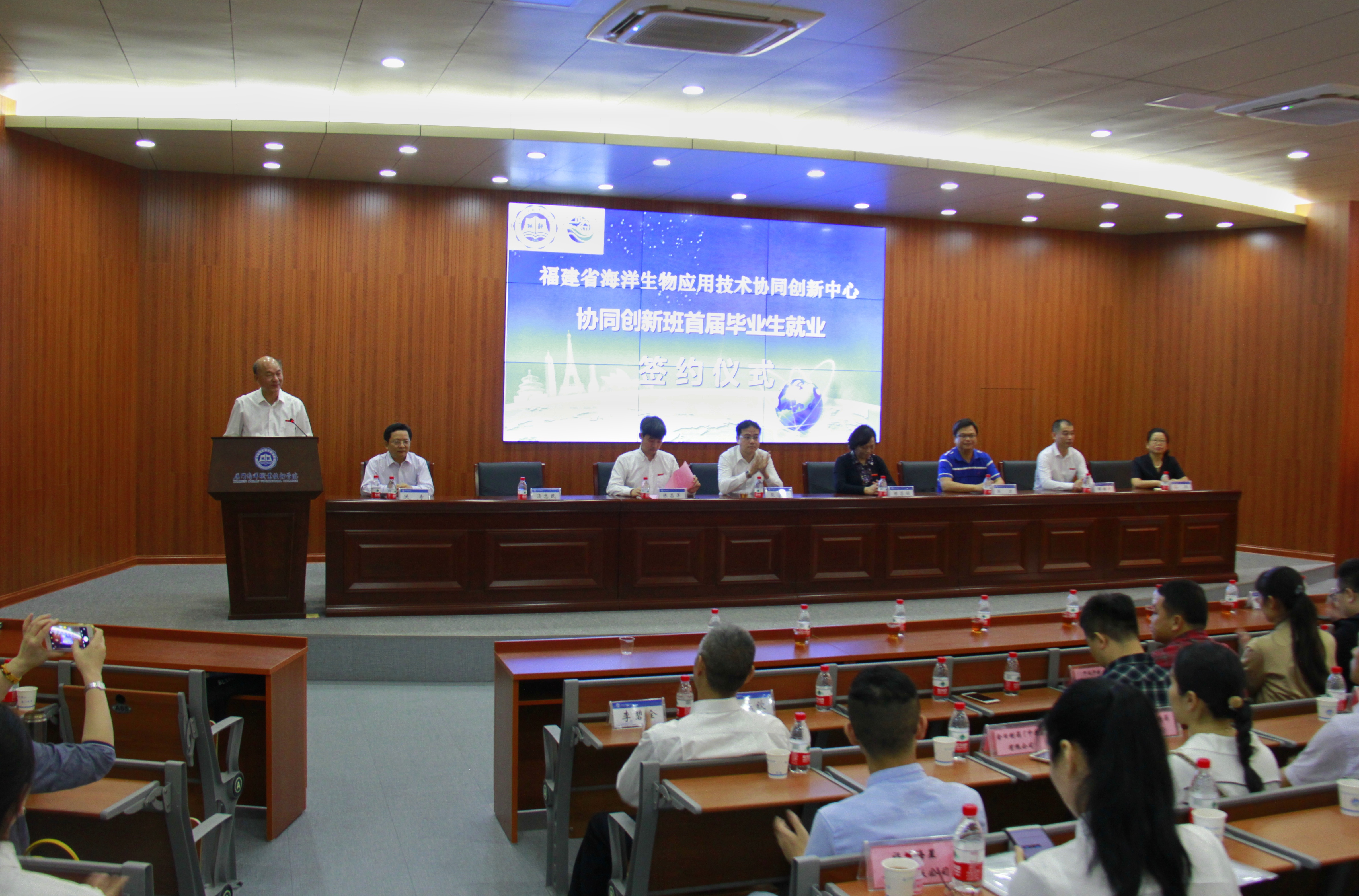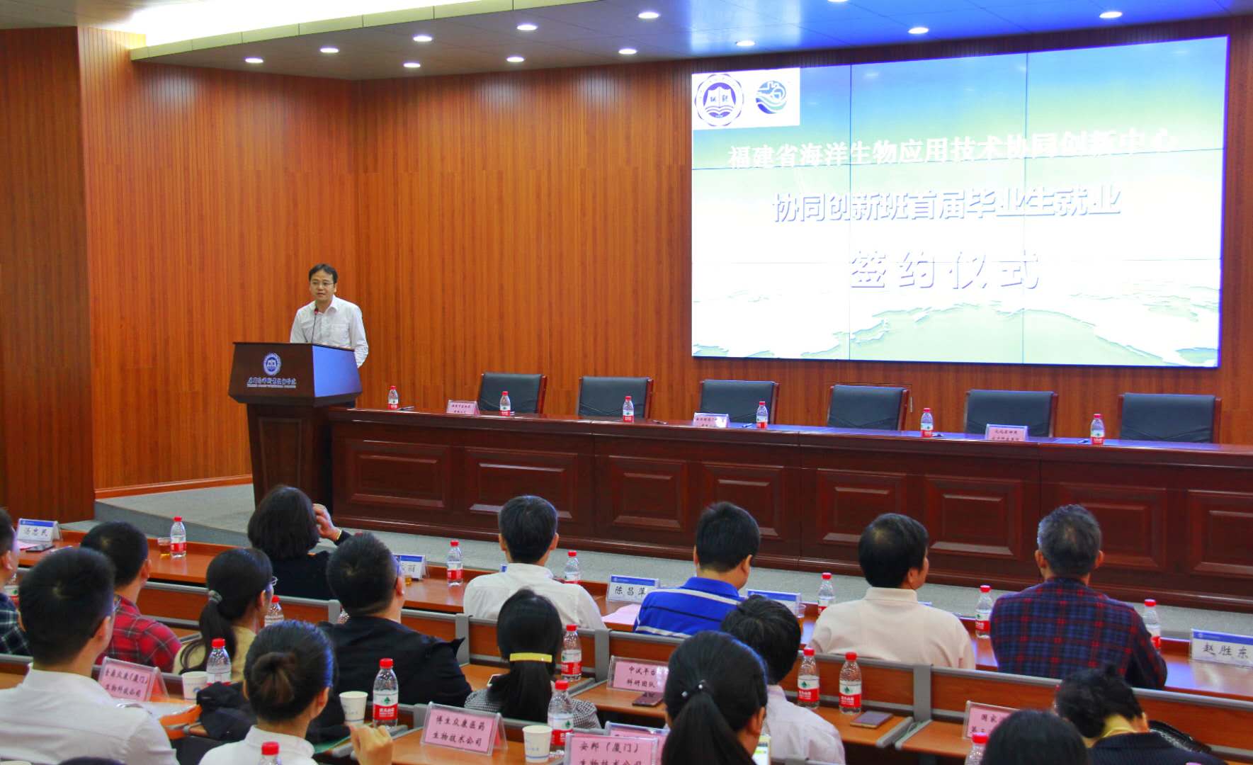 2018年11月15日,福建省海洋生物应用技术协同创新中心协同创新班首届毕业生就业签约仪式在翔安校区学术报告厅隆重举行。国家海洋局第三海洋研究所副所长张海峰、产业处处长陈力,蔡兵研究员、洪专教授及其科研团队成员,我院党委书记陈苏丽、院长陈昌萍、纪委书记缪雄平及科研处、教务处、学生处、生物技术系的相关领导、老师出席活动。学院党委副书记汤忠民担任主持。