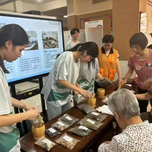 “这香囊闻着清爽,挂在船上还能防蚊子!”团队带来的中草药香囊制作环节,成了活动的“人气王”。成员们提前查阅资料、请教专业老师,精选艾草、薄荷、丁香等具有驱蚊功效的中草药,现场教居民们配比、缝制。