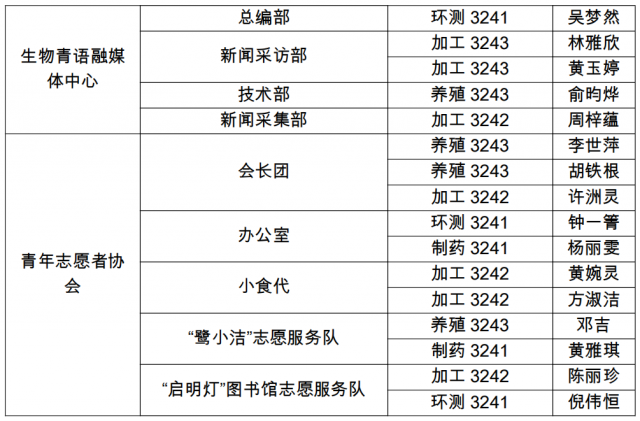 海洋生物学院第二十届生物青语融媒体中心以及青年志愿者协会负责人名单人员如下: