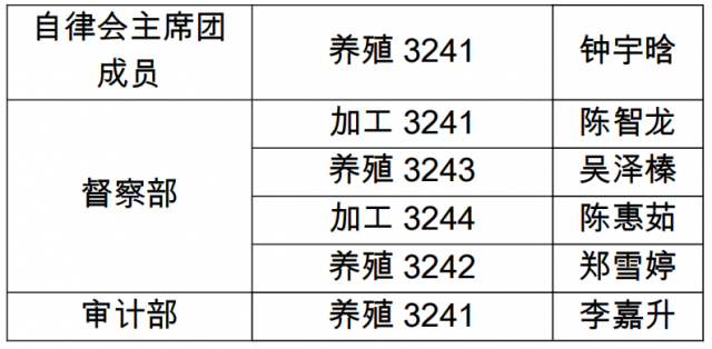 海洋生物学院第二十届自律会学生负责人名单人员如下:
