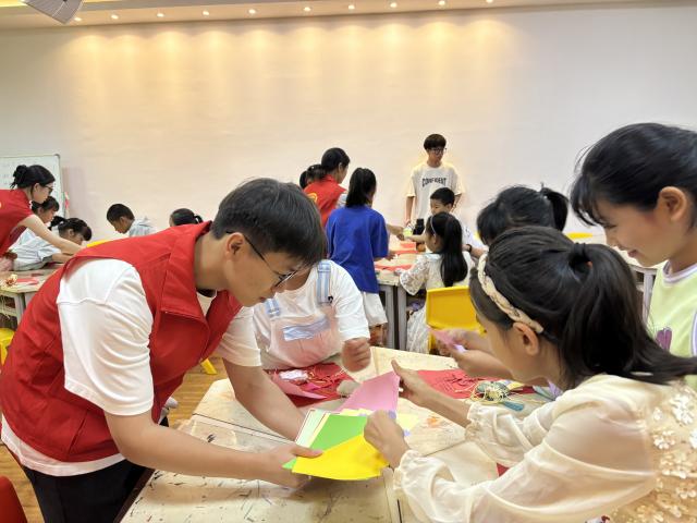 一张彩纸,几番折叠,便能在指尖绽放出清雅的莲花。实践队员手把手教小朋友们折纸莲花,淡粉色、白色的彩纸在孩子们手中翻转、按压,塑造出莲花 “出淤泥而不染” 的立体姿态,莲花的清雅与端午的文化韵味一同在指尖绽放。