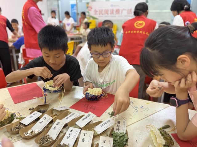 桌上整齐摆放着菖蒲、艾草、丁香、藿香等中药材,氤氲着古朴而清新的药香。实践队员轻轻捻起一束艾草,向围坐的小朋友们娓娓道来:“千年前,古人便会在端午佩戴香囊,不仅是雅致的装饰,更是驱邪避瘟的‘小卫士’!” 孩子们眼中满是好奇,迫不及待地尝试调配香料、制作属于他们独一无二的香囊。孩子们不仅收获了专属端午信物,更在动手实践中感受到菖蒲艾草的芬芳。
