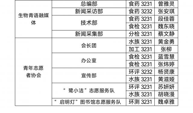 经学生干部培训后认定、民主表决、学院审核,海洋生物学院第十九届生物青语融媒体中心以及青年志愿者协会负责人名单公示如下: