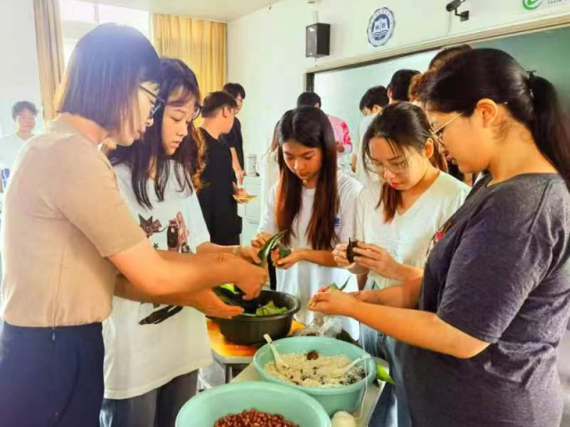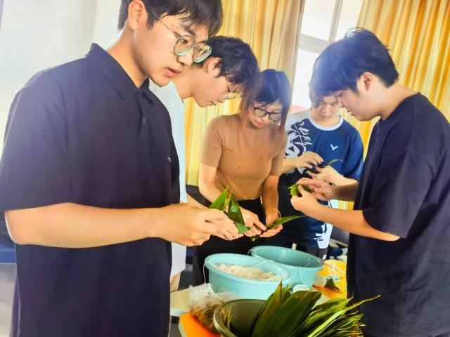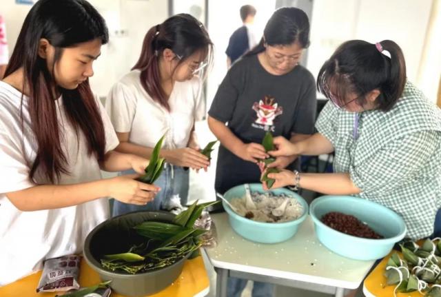 包粽子,不仅是一种手艺的传承,更是一种情感的纽带。老师同学们围在一起,一边谈论着日常的学习生活,一边动手包粽子,其乐融融的氛围让人倍感温暖。活动现场有两位来自泰国的留学生——廖慧娥和洪玉洁,她们感叹于中华民族传统文化的博大深厚,也对中国传统劳动人民的手工艺赞叹不已。每一个粽子都蕴含着我们对传统文化的敬意和对美好生活的期许。团总支书记刘梦绮老师和辅导员朱苏琴老师通过手把手教授在场的同学们包粽子,传达了对新时代青年肩负起传承传统文化的期许。