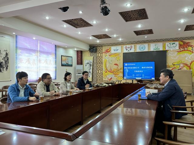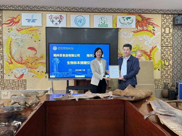 11月21日上午,韩味苔食品有限公司标本捐赠仪式暨交流座谈会在翔实1501举行,海洋生物学院党总支书记赵梅英、院长蔡真珍、副院长何艺宾、副院长王俊、食品与药品教研室主任孙兆敏老师等对韩味苔食品有限公司总经理刘荣如的来访表示热烈欢迎。捐赠仪式由赵梅英主持。