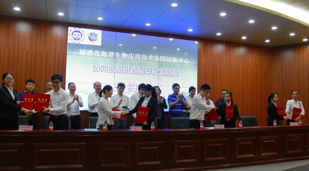 2018年11月15日,福建省海洋生物应用技术协同创新中心“协同创新班”首届毕业生举行了就业签约仪式,18家国内知名企业与协同创新班30名毕业生签属就业协议,学院院长陈昌萍授予录用企业“创新人才培育基地”牌匾。这是学院产学研“零对接”的成功实践,是协同育人、产教融合的升级,把海洋专业建设、海洋关键共性技术研发和创新型海洋技术技能人才培养紧密结合起来,是对现代高等职业教育改革的积极探索和大胆创新。人民网、中国人才网、搜狐网、东南网、福建日报、海西晨报、福建教育电视台、福建省教育厅网站等媒体先后报道了“协同创新班”培养成效。
