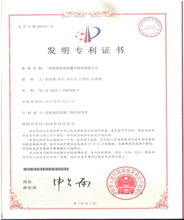 厦门海洋职业技术学院、自然资源部第三海洋研究所、厦门汇盛生物有限公司合作的产学研项目----药品级藻油DHA制备关键技术研发取得阶段性进展:建立了DHA乙酯的HPLC快速定量方法、优化了酯化条件等;在产学研项目----DHA藻油生产过程产生的离心上清液制备叶面肥、海藻生物营养液的研制上,建立DHA藻油离心上清液成分的检测分析方法。发表论文4篇,申请发明专利2项。福建安井食品股份有限自协同创新中心立项以来,申请发明专利16项,涉及冷冻调理水产品加工技术开发(一种提高鱼糜制品凝胶强度的微波组合加热方法CN201710303148.6等)、冷冻调理水产品加工设备创制(一种馅料连续输送装置CN201810101476.2等)等方面。