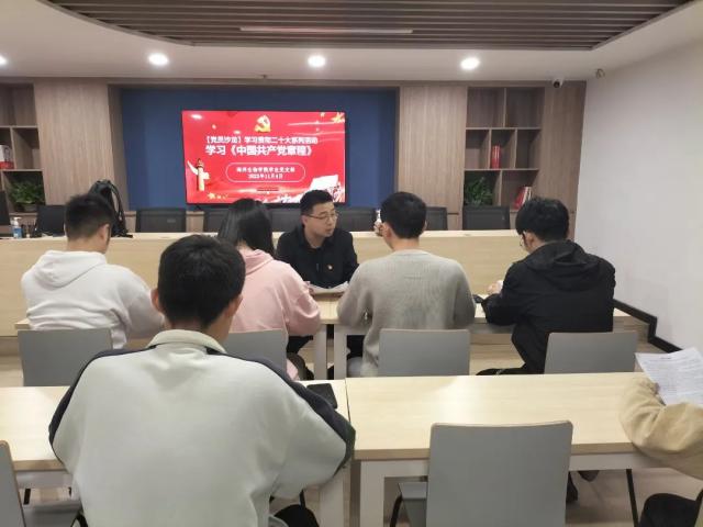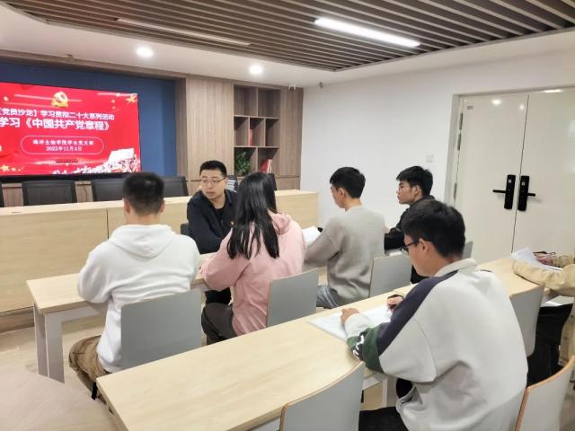 11月4日,海洋生物学院学生党支部组织在校支部党员、发展对象在一站式服务中心党建活动室开展沙龙学习活动,在校外实习的党员以线上学习形式参加本次沙龙活动,学生党支部书记陈鸿同志带头领学新修订的《中国共产党章程(修正案)》。