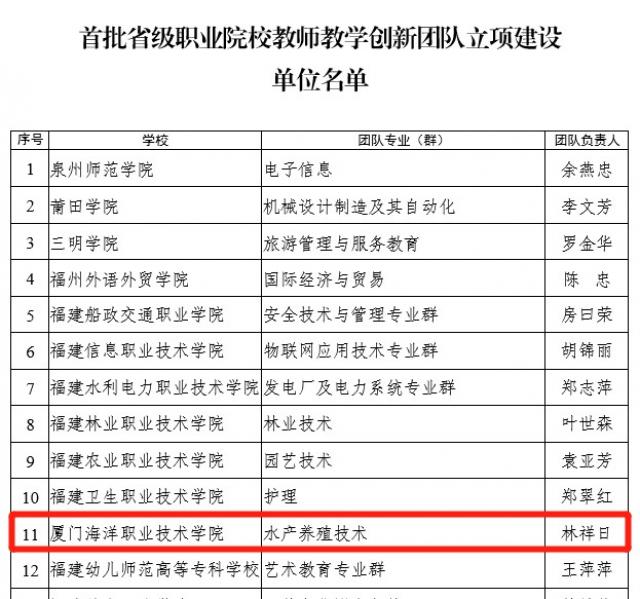 根据《福建省教育厅关于印发福建省职业教育教师教学创新团队建设方案的通知》(闽教师〔2020〕47号)、《福建省教育厅办公室关于遴选首批省级职业院校教师教学创新团队的通知》(闽教办师〔2020〕34号),我院申报的水产养殖技术专业群教师教学创新团队获批立项,林祥日老师任团队负责人。
