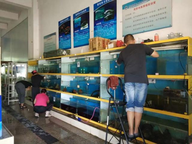 由于疫情影响,寒假学生离校至今共五月有余,水族缸荒废无人打理,其中大部分缸内已积满灰尘,一些缸内水体已浑浊发臭,甚至个别缸内出现不明生物的腐烂尸体。实训室全体教师,共6人,不畏污物、不惧异味、伴随着蚊虫叮咬、登高爬低、从早至晚的不懈努力数日,终将水族实训室内共118个鱼缸全部清理干净,确保每一面玻璃透洁如新、每一缸水体清洌可鉴。