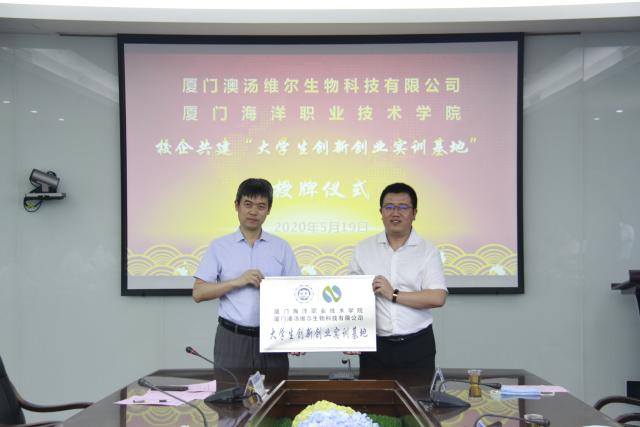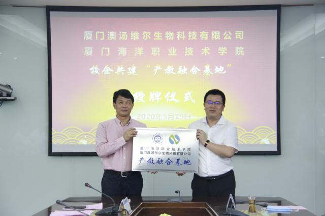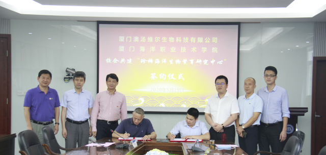 为深化产教融合,推进学院创新发展,2020年5月19日厦门海洋职业技术学院、厦门澳汤维尔生物科技有限公司校企合作签约仪式在翔安校区隆重举办。厦门海洋职业技术学院党委书记陈一端、院长陈昌萍、副院长孙学耕、相关部门负责人、教师代表及厦门澳汤维尔生物科技有限公司总经理陈雄平、公司党支部书记江增水、副总经理魏志煌、企业技术骨干到场参加,活动由学院科研与产教融合处处长苏国新主持。