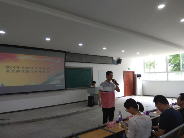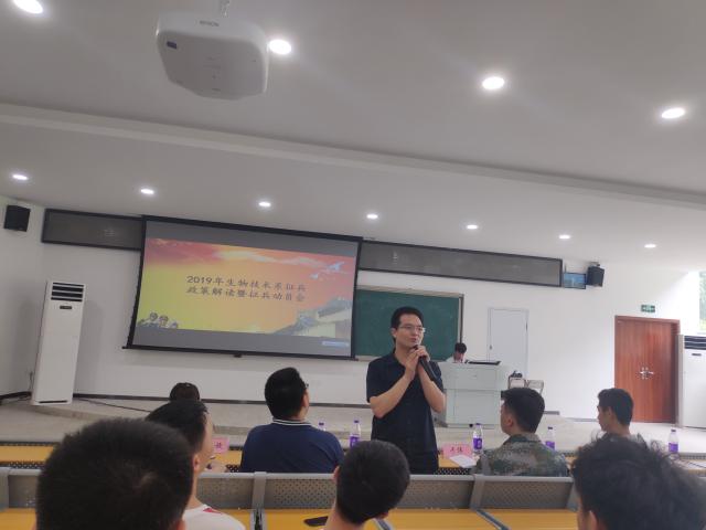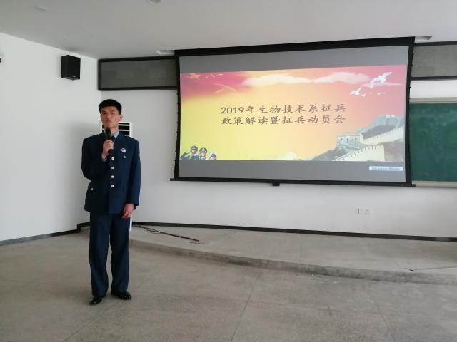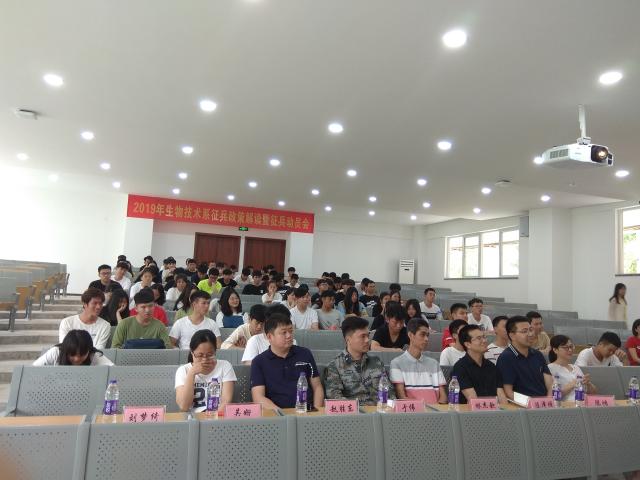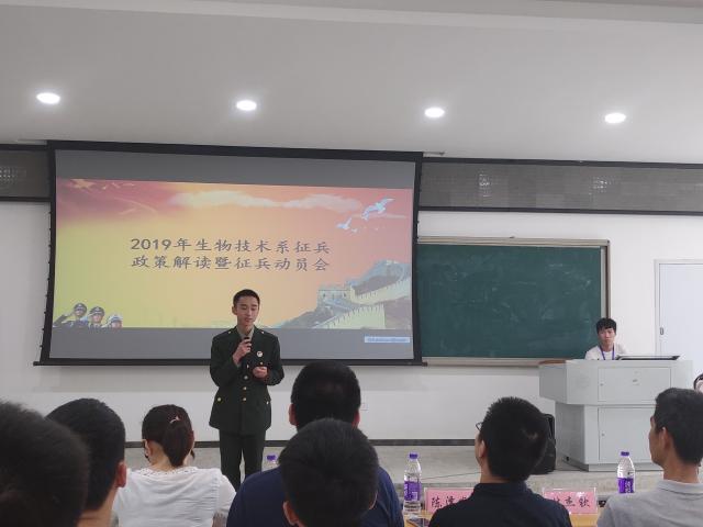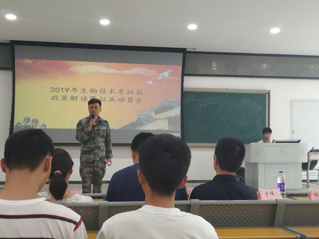 为响应国家号召,落实党和国家政策,推动我校大学生征兵入伍工作深入开展,再上新台阶,5月16日生物技术系2019年大学生征兵工作动员大会于翔教T1隆重举行。