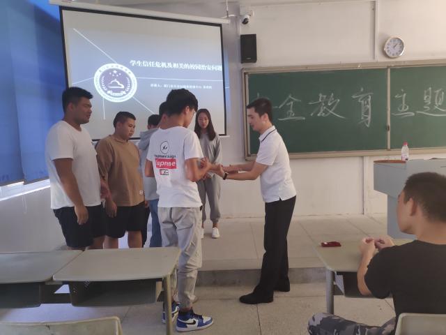 会议伊始,黄警官给我们简要介绍了关于安全教育方面的知识。让同学们参与了一个关于信任的小游戏,从而引出本次讲座的主题之一——信任危机。主观偏激、情感焦虑、网络成瘾、学习异化等等这些都是产生信任危机后所表现出的一系列问题。黄警官进一步讲解了如何解决信任危机,让我们受益匪浅。随后黄警官还讲到了校园欺凌事件,当黄警官说起校园欺凌时,现场的气氛有点沉重。通过生活实例形象地向同学们讲述了校园周边存在的一些安全隐患和校园安全常识。