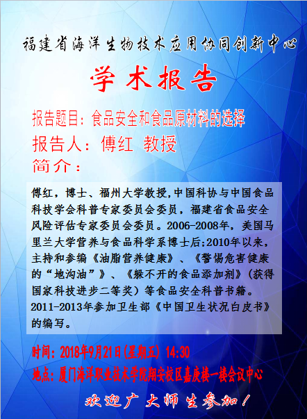 2018年9月21日福州大学生物科学与工程学院傅红教授受邀来到厦门海洋学院,给“协同创新班”的同学们带来了题为《食品安全与食品原材料的选择》的学术报告。