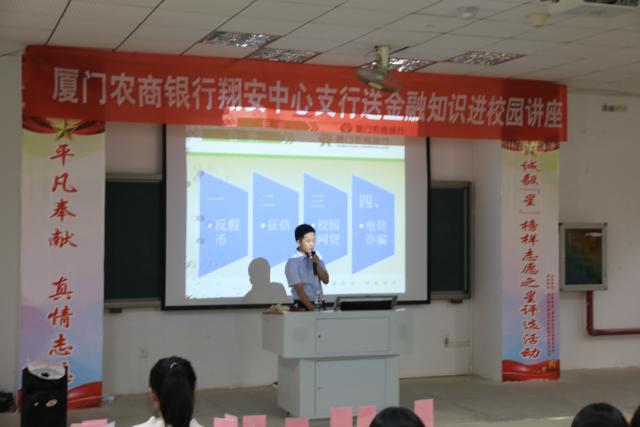 9月25号下午我系邀请了厦门农商银行新城支行工作人员在T1开展了金融知识进校园讲座,书记林杰钦和辅导员乐丽婷老师出席了本次讲座,17、18级部分同学参加。