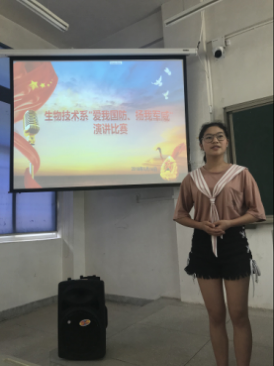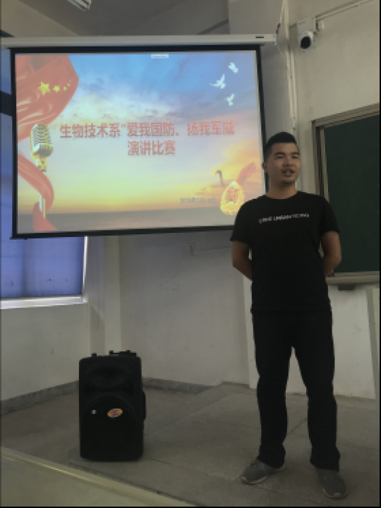 参赛选手主要是生物系的退伍士兵、有志于参军的同学,来自于新疆的达吾然乌拉孜汉也报名参加比赛。他们以“爱我国防、扬我军威”为主题,结合自身军训经历或参军体会,讲述自己对国防的理解以及关心国防、热爱国防、建设国防、保卫国防的雄心壮志。经过激烈角逐,加工3171班的曾超清同学和养殖3171班的陈泽兴同学分别获得第一名和第二名,并将代表生物系参加学院“爱我国防、扬我军威”主题演讲比赛。