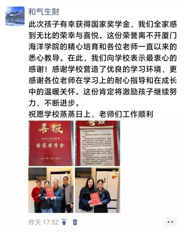 以爱为舟,家校同心。新的一年,学院将继续以家校共育为纽带,把育人工作做扎实,持续深化资助育人成效,让榜样的力量激励更多学子奋勇争先,让温暖的关怀陪伴每一位学子茁壮成长,为培养更多德才兼备的海洋生物专业人才而不懈努力!